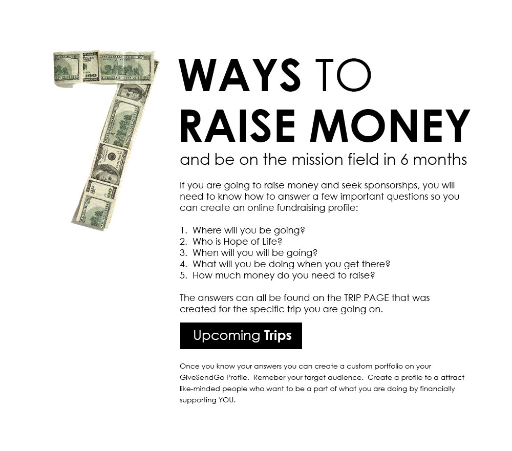 Advertise specific skills on your social media that u may have to offer people in need of their services to raise funds. (Examples: Babysitting, Painting, Web Design, Photography, Transportation, etc…) |